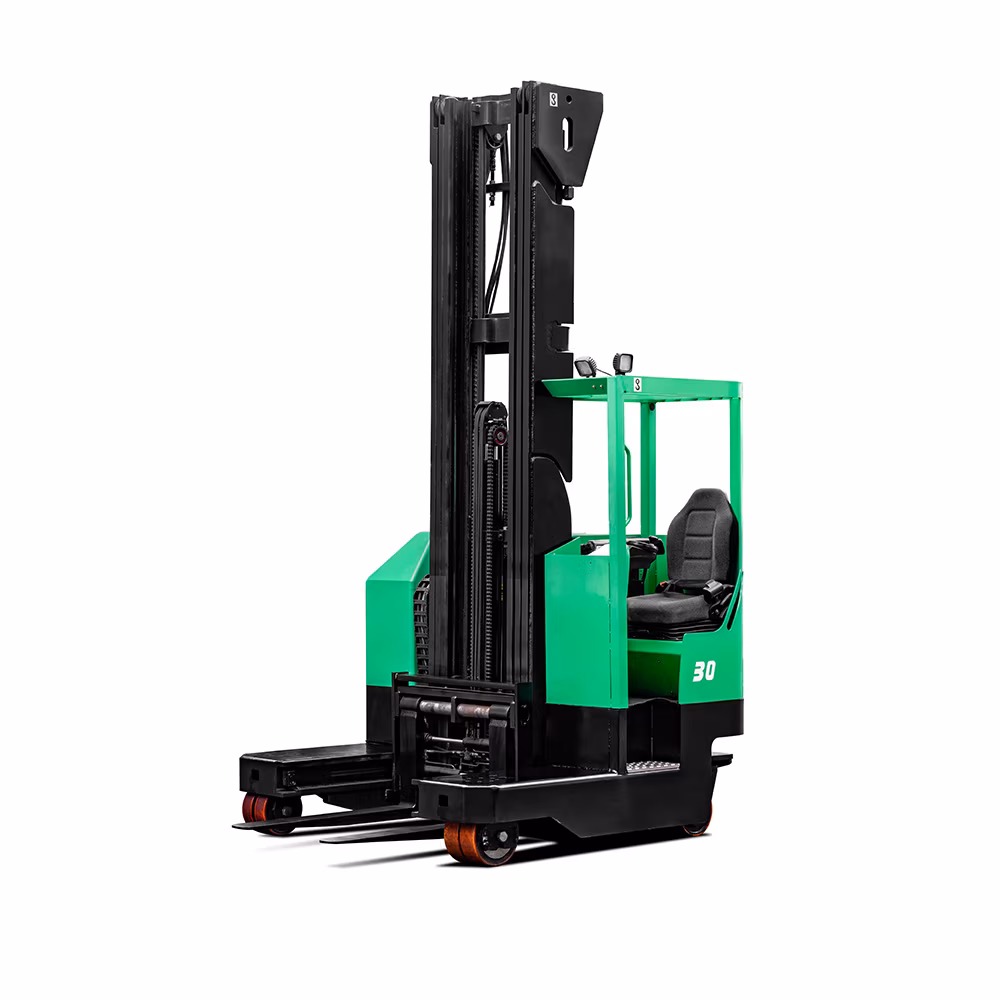 Vícestranný elektrický vysokozdvižný vozík o nosnosti 2–3 tuny lze ovládat v režimech přímého pohybu, bočního pohybu a otáčení o 360° na místě atd. Je vhodný pro místa s potřebou manipulace a stohování velkých a dlouhých materiálů, jako jsou trubky, plechy a dráty, a dokáže uspokojit potřeby zákazníků pro provoz v úzkých uličkách a při vysokých výškách stohování.